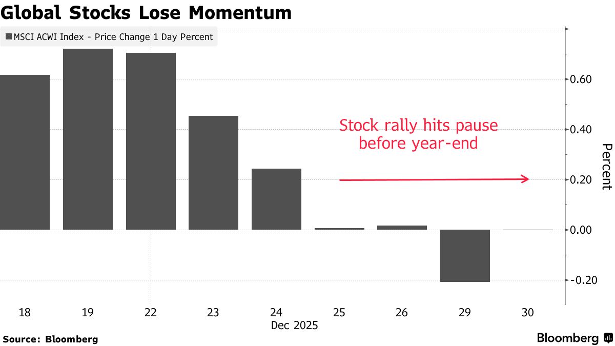 “The overriding theme is that global stock indices have lost momentum into year-end,” wrote Kathleen Brooks, research director at XTB. “There are plenty of reasons for this, including decent returns for 2025, and investors waiting to make big trading decisions until after the Christmas break.”