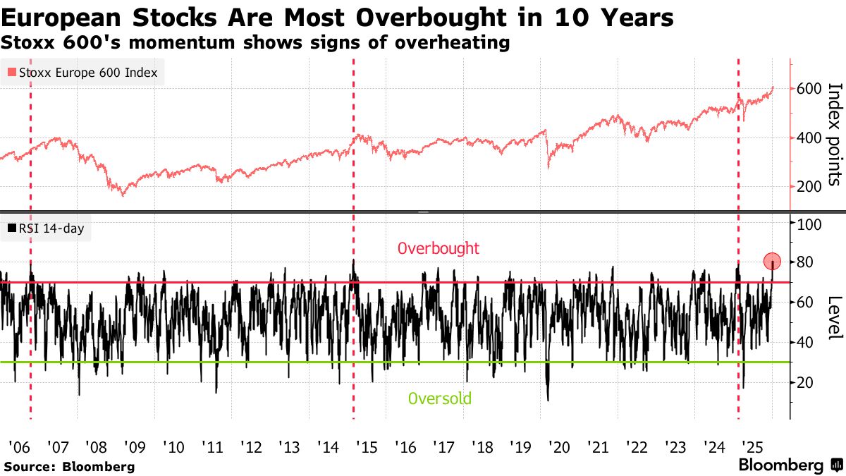 - The benchmark Stoxx Europe 600 index’s 14-day Relative Strength Index has climbed above 80, suggesting to technical analysts that a period of consolidation lies ahead or that a market top may not be far off.